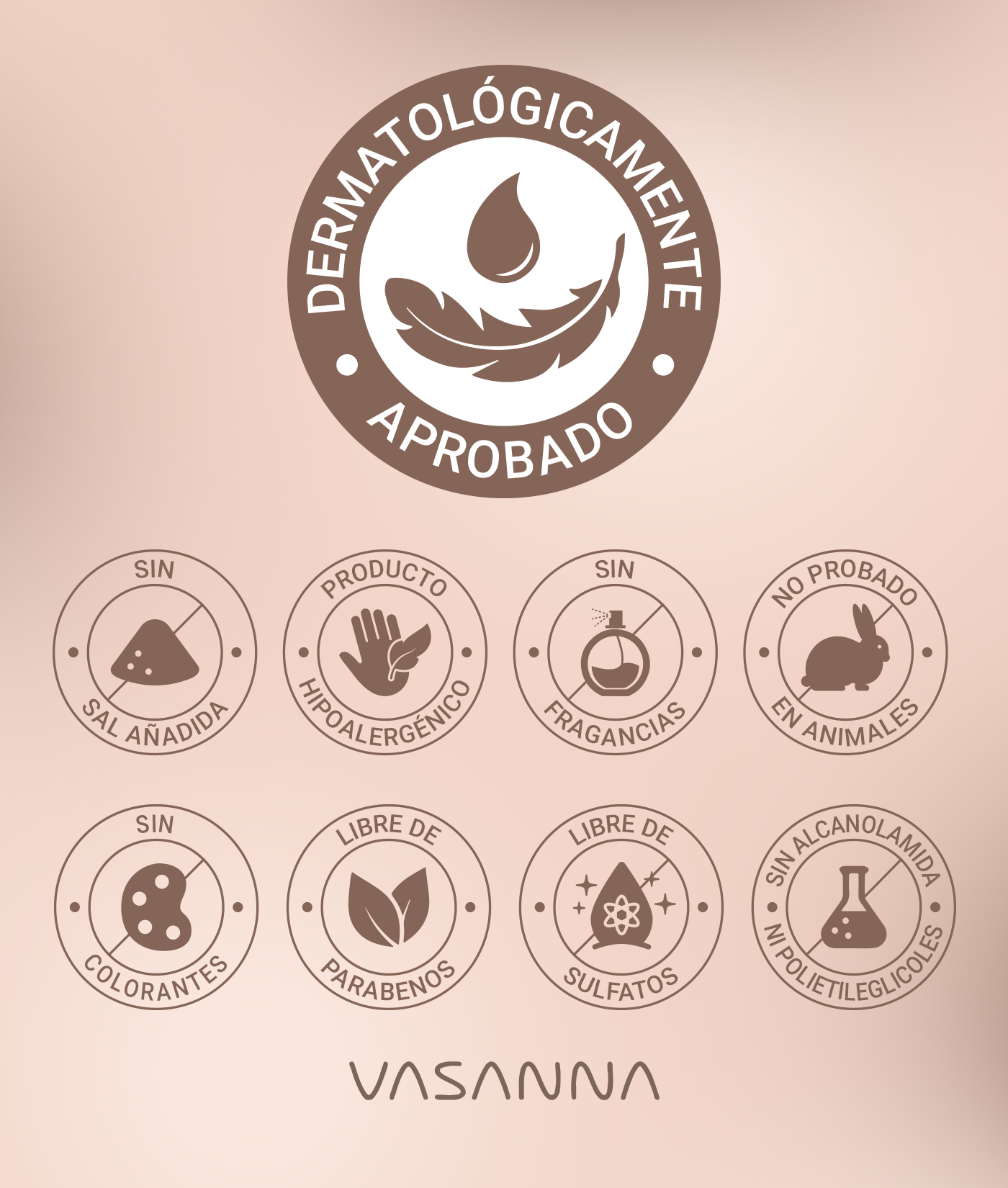 Nuestra loción limpiadora tipo syndet VASANNA, limpia, mantiene y protege la piel de tu zona íntima. Nuestra formula es desarrollada a base de extractos 100% naturales, como extracto de germen de trigo, aceite de ricino y extracto de aloe Vera como principales agentes activos, que gracias a su potente acción antioxidante promueven la hidratación y mantienen el balance natural de la zona V, protegiéndola contra la irritación, picazón y sensibilidad.